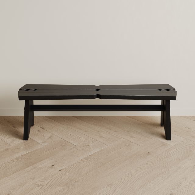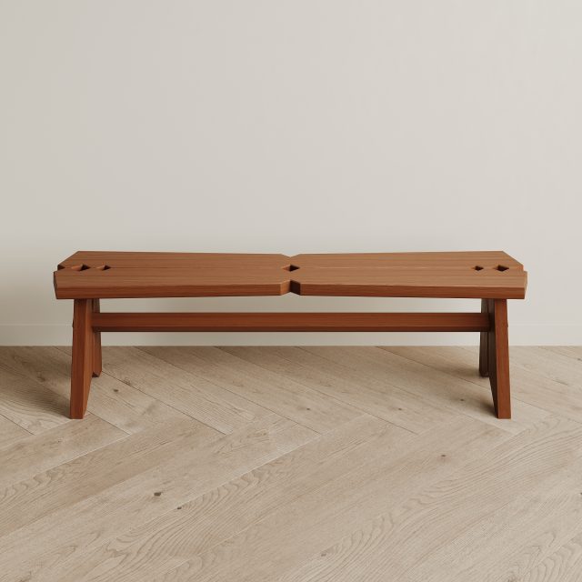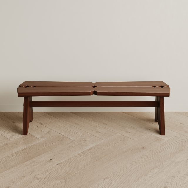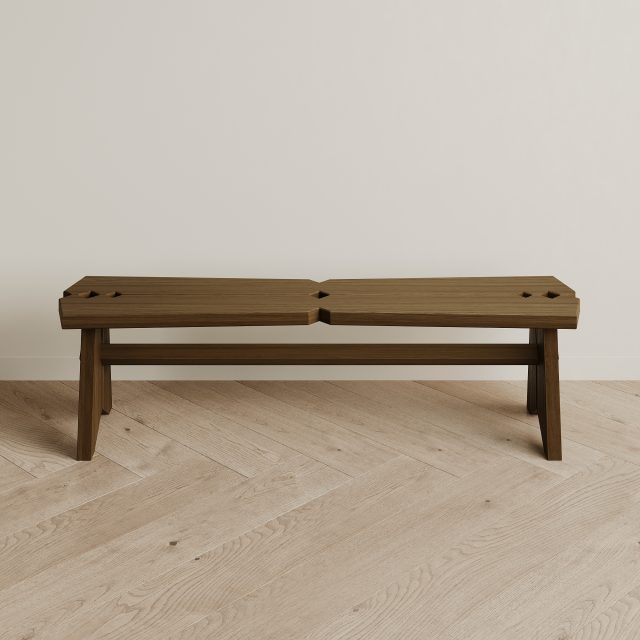 Скамья из новой серии УЗОРЫ была разработана дизайнером и сооснователем бренда Марией Евтюшенковой во время участия в исследовательской лаборатории Артель для выставки во Всероссийском музее декоративного искусства. В рамках лаборатории дизайнер изучала архивные материалы и книги о русских народных предметах быта и декоративных приёмах работы с деревом, посетила Музей-заповедник «Кижи» в Карелии. Эта поездка вдохновила ее на использование деликатных отсылок к русскому деревянному зодчеству при разработке предметов для этой серии.Скамья УЗОРЫ выполнена полностью из массива дуба, сочетая классические и современные приемы деревообработки и элементы сквозной резьбы. Дизайн вызывает ассоциации с формами и деталями, характерными для внешних декоративных архитектурных элементов русской избы (причелины, огниво, элементы на окнах), но при этом вписывается в лаконичную эстетику коллекции бренда.