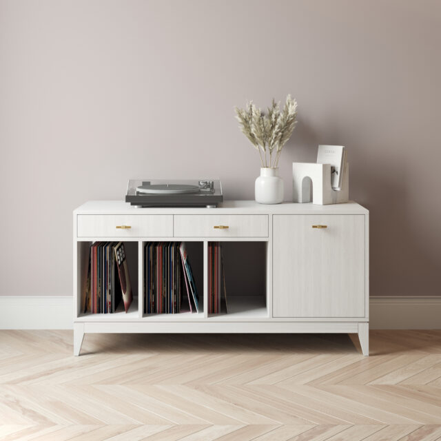Универсальная тумба для винилового проигрывателя. Может быть использована в качестве комода или тумбы ТВ. Конструктив разработан дизайнером Маргаритой Гайдук @gorelectrotrans (www.architectured.ru).Особенности конструкции: фасад справа - распашной (петли плавного закрывания с доводчиком), за ним по центру съемная полка. Ящики над открытыми секциями - выкатные (шариковые направляющие с доводчиком). В открытых отделениях для пластинок задней стенки нет. Размер секции справа не меняется в зависимости от длины, ящики над открытыми секциями становятся шире. Дополнительные вырезы под розетки и провода осуществляются силами заказчика самостоятельно. Поставляется в собранном виде.