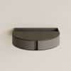 Компактный объект изготовлен из тонкого металлического листа: детали вырезаны лазером, аккуратно согнуты и соединены между собой. Благодаря такой технологии дизайнерам удалось добиться легкости конструкции и чистоты линий. Верхняя поверхность и внутренние ящики отделаны натуральной матовой кожей глубокого черного оттенка: она смягчает холодность и строгость металла и приглушает звук от телефона, стакана и других предметов.