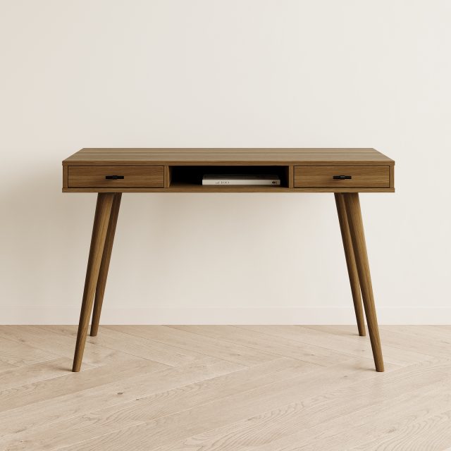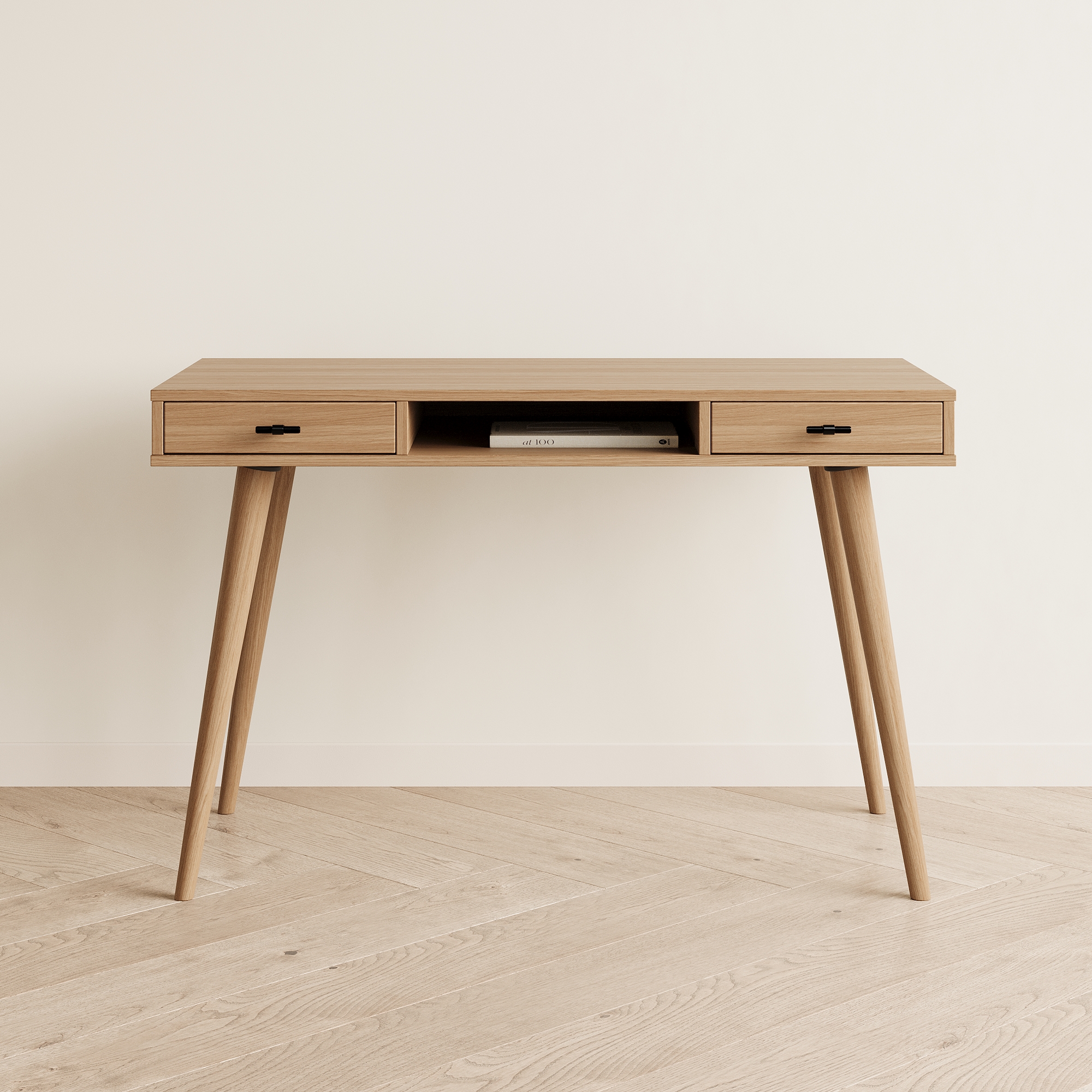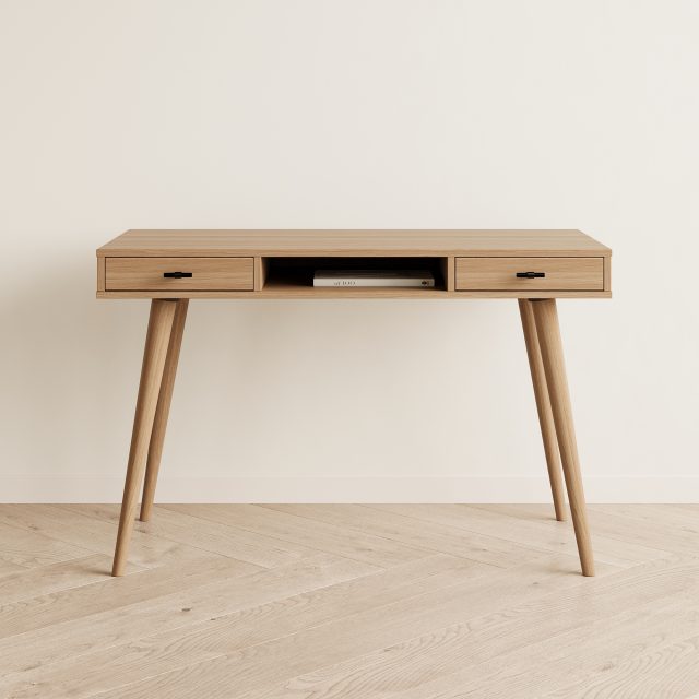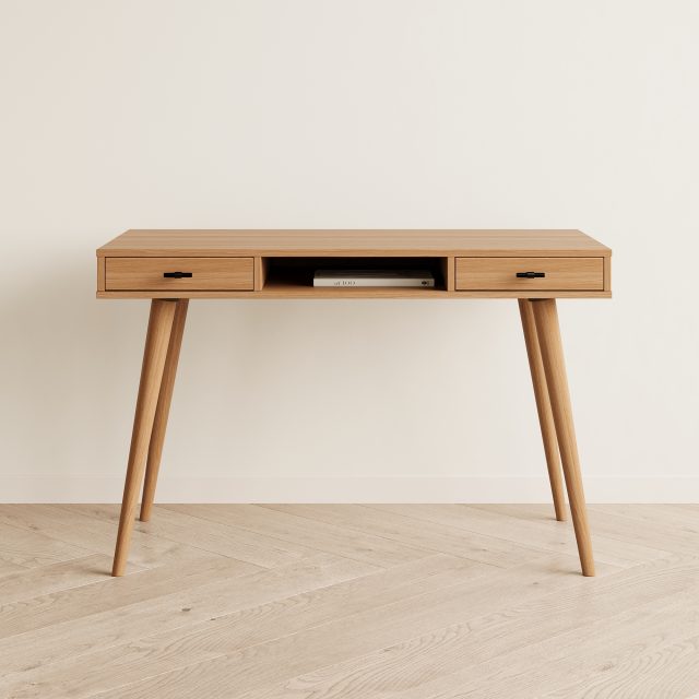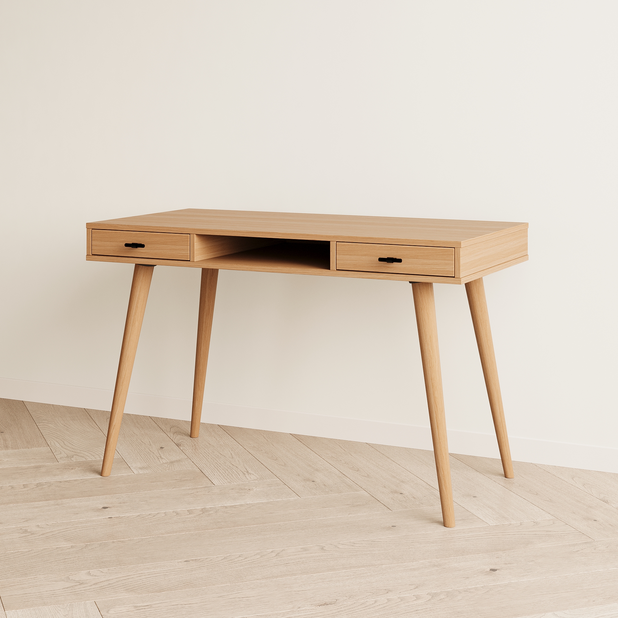 Особенности конструкции: 2 выкатных ящика (шариковые направляющие с доводчиками). Центральная секция открытая. Ножки монтируются самостоятельно - легко вкручиваются в коннекторы швейцарского производства. Цвет коннекторов - чёрный.Варианты отделок: при выборе натуральных оттенков дерева (дуб/светлый орех и т.д.), поверхности будут со структурой дерева. При покрытии эмалями в однотонный цвет (белый/чёрный/RAL/NCS), можно выбрать поверхности: гладкие или со структурой дерева. В этом случае, в комментарии к заказу нужно указать необходимый оттенок эмали и какой вариант поверхностей вам нужен.
