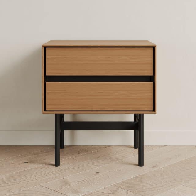 Прикроватная тумба VESTA - образец современного дизайна, созданного на основе опыта, который мы получили от европейских коллег. Внешние стенки выполнены из тонкого материала, что выглядит очень эффектно. Внутренний каркас контрастного чёрного цвета спрятан за этими стенками. Выкатные ящики также чёрные.Особенности конструкции: 2 выкатных ящика (направляющие скрытого типа с доводчиком). Ручка интегрирована в фасад - выполнена в виде запила под 45 градусов. Основание из металла с круглым сечением ножек.