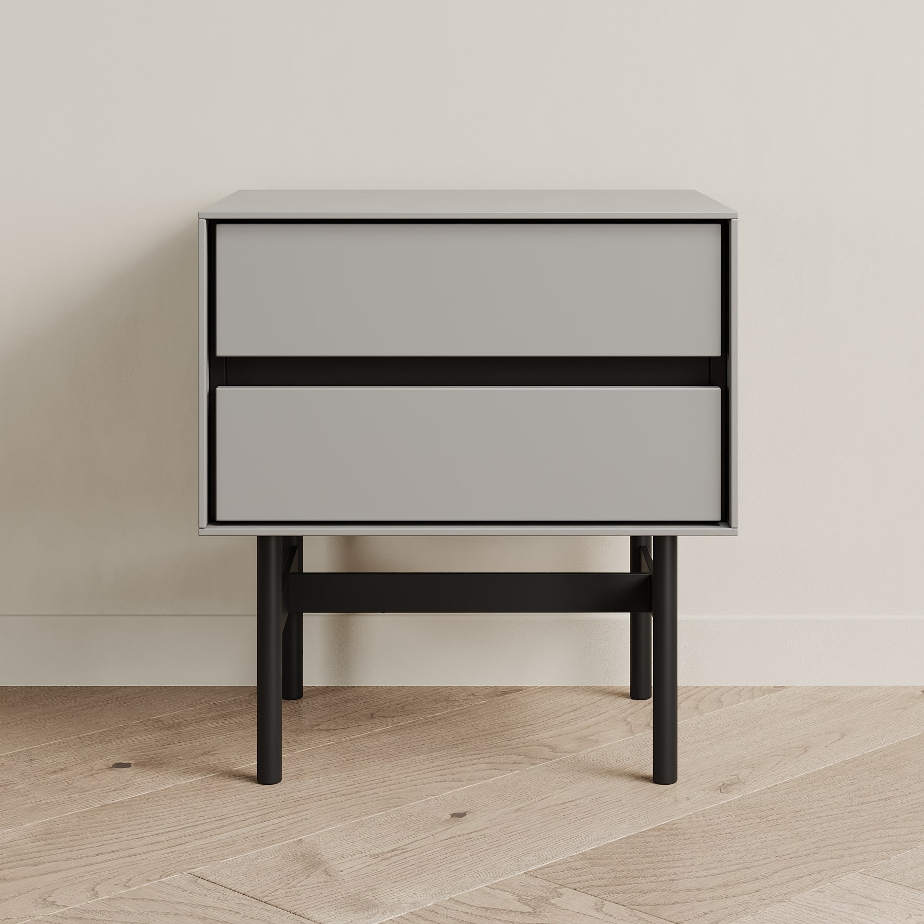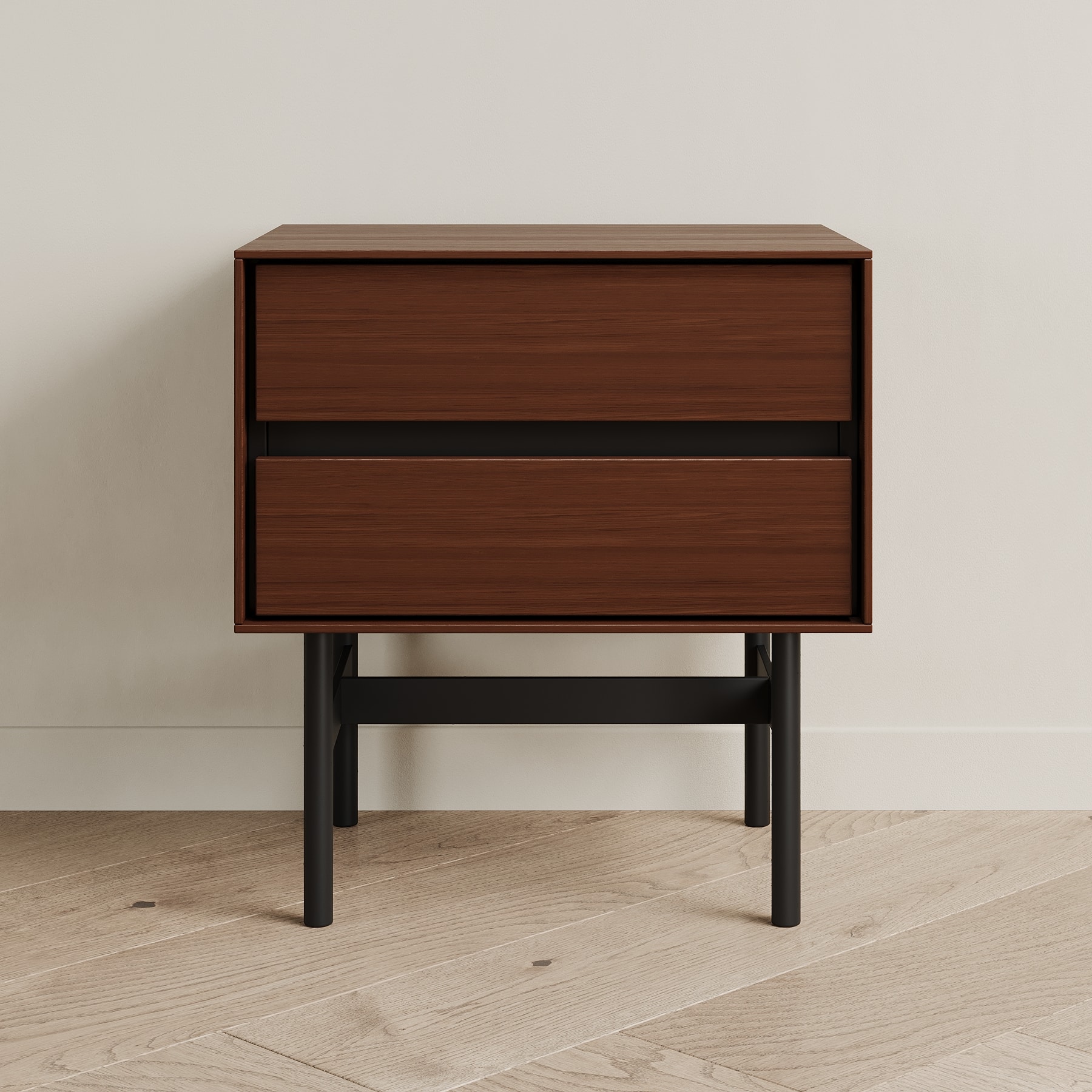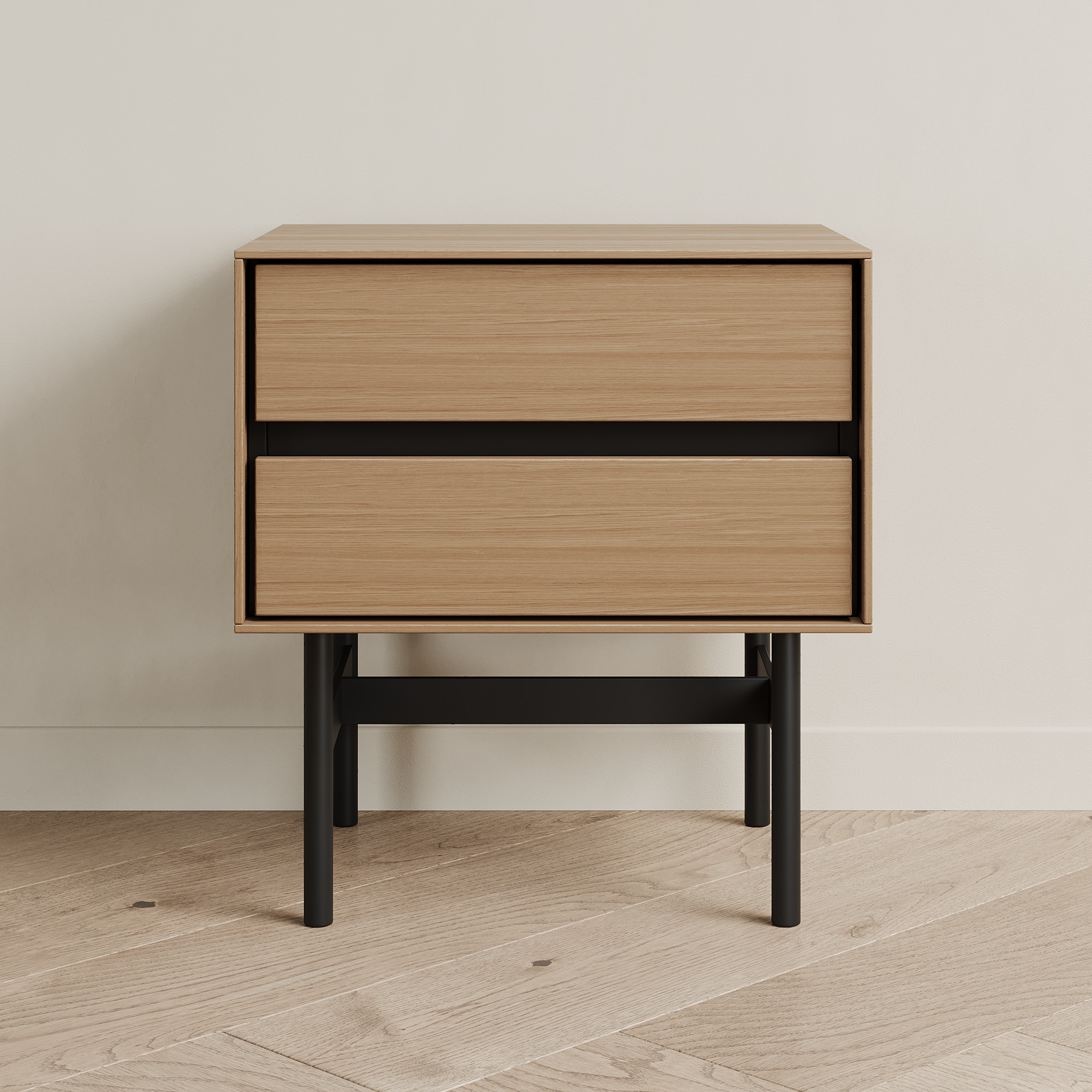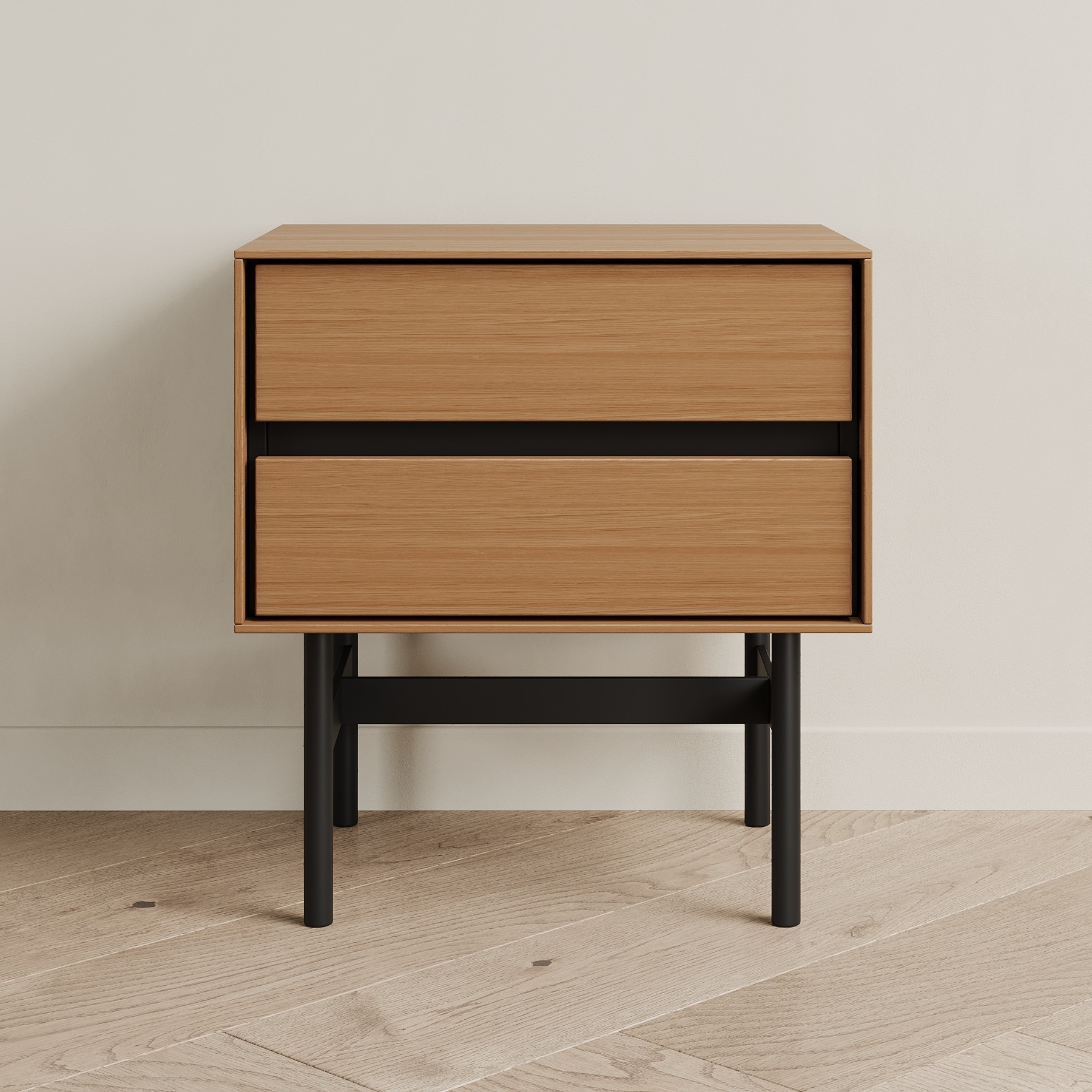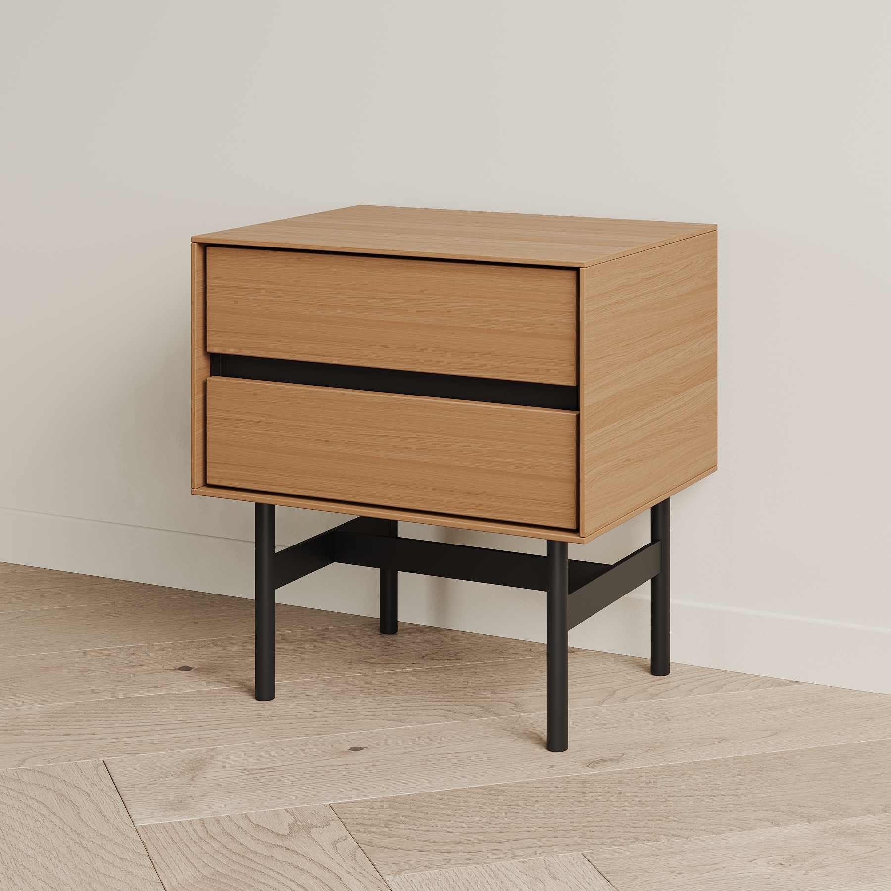 Прикроватная тумба VESTA - образец современного дизайна, созданного на основе опыта, который мы получили от европейских коллег. Внешние стенки выполнены из тонкого материала, что выглядит очень эффектно. Внутренний каркас контрастного чёрного цвета спрятан за этими стенками. Выкатные ящики также чёрные.Особенности конструкции: 2 выкатных ящика (направляющие скрытого типа с доводчиком). Ручка интегрирована в фасад - выполнена в виде запила под 45 градусов. Основание из металла с круглым сечением ножек.
