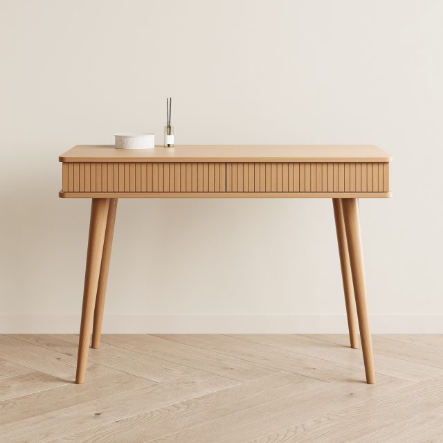 Стол VIVA разработан по эскизу дизайнера Елены Илюхиной (www.instagram.com/ilyukhina_elena). Эта модель письменного стола со скругленными углами и сужающимися к низу токарными ножками была вдохновлена эстетикой мебели 50-х годов, стилем mid-century. Вертикальная фрезеровка на фасадах добавила этой модели индивидуальности. Расширенная размерная линейка позволит его использовать не только как письменный, но и как консольный или туалетный столик.Особенности конструкции: 2 выкатных ящика (шариковые направляющие push-to-open). ВНИМАНИЕ! Ящик открывать и закрывать нажатием по центру фасада. Нажатие по краям фасада приводит к некорректной работе направляющих! Ножки монтируются самостоятельно - легко вкручиваются в коннекторы швейцарского производства. Цвет коннекторов - чёрный.