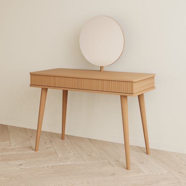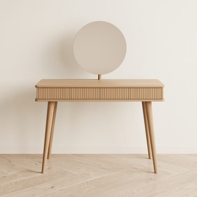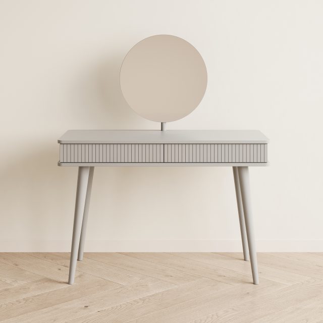 Эта модель туалетного столика со скругленными углами и сужающимися к низу токарными ножками была вдохновлена эстетикой мебели 50-х годов, стилем mid-century. Вертикальная фрезеровка на фасадах добавила этой модели индивидуальности. Различные оттенки и размеры дают возможность подобрать стол под особенности вашего интерьера. Но самое главное в нём - это, конечно, зеркало, о котором мечтает каждая девушка.Особенности конструкции: 2 выкатных ящика (шариковые направляющие push-to-open). ВНИМАНИЕ! Ящик открывать и закрывать нажатием по центру фасада. Нажатие по краям фасада приводит к некорректной работе направляющих! Ножки монтируются самостоятельно - легко вкручиваются в коннекторы швейцарского производства. Цвет коннекторов - чёрный.