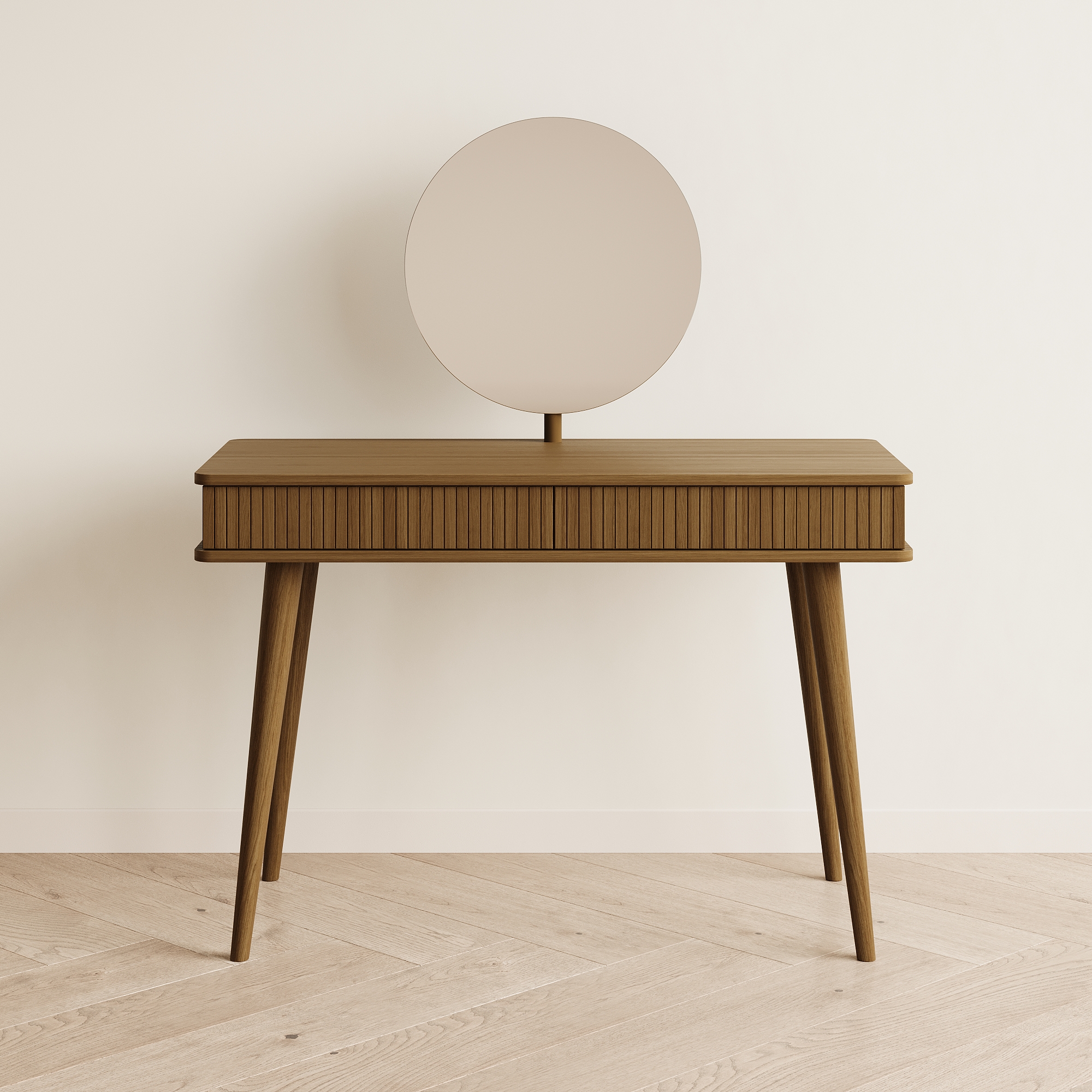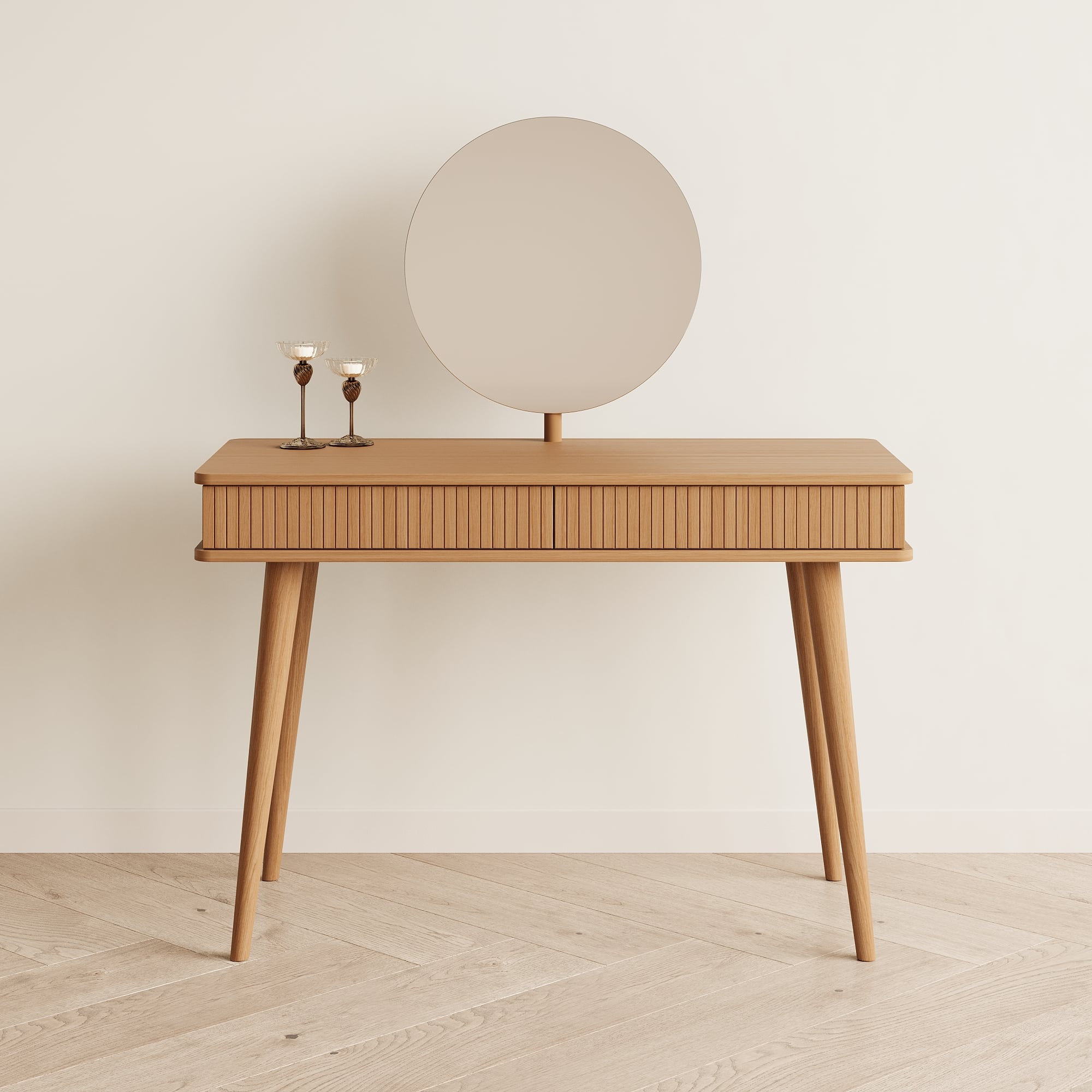 Эта модель туалетного столика со скругленными углами и сужающимися к низу токарными ножками была вдохновлена эстетикой мебели 50-х годов, стилем mid-century. Вертикальная фрезеровка на фасадах добавила этой модели индивидуальности. Различные оттенки и размеры дают возможность подобрать стол под особенности вашего интерьера. Но самое главное в нём - это, конечно, зеркало, о котором мечтает каждая девушка.Особенности конструкции: 2 выкатных ящика (шариковые направляющие push-to-open). ВНИМАНИЕ! Ящик открывать и закрывать нажатием по центру фасада. Нажатие по краям фасада приводит к некорректной работе направляющих! Ножки монтируются самостоятельно - легко вкручиваются в коннекторы швейцарского производства. Цвет коннекторов - чёрный.